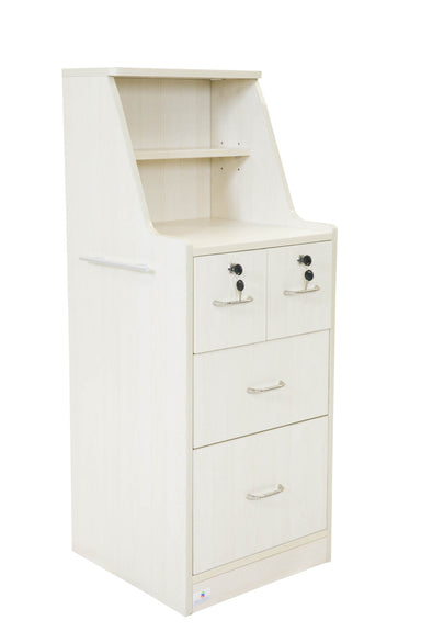 View full detailsBeech woodgrain bedside locker with 3 drawers and hutch shelf above drawers. Top drawer is lockable Hidden castors. Bottom dumper drawer. Specific...