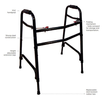 Steel construction PVC handgrips Height adjustable extension legs Easy-fold mechanism for storage and transportation Replaceable skid resistant ru...